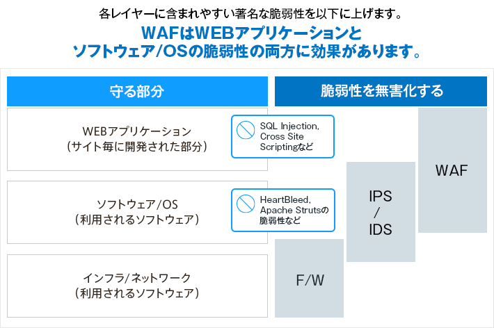 一般的なF/Wでは、「SQLインジェクション」や「クロスサイトスクリプティング」、「パラメータ改ざん」等は防げません。また、IPS/IDSにおいては難読化されている攻撃に対する検知精度は低いと言われています。 実際、WAFで検知したサイバー攻撃のうち、IDS/IPSはその半数以上を検知できなかったという報告もあります。