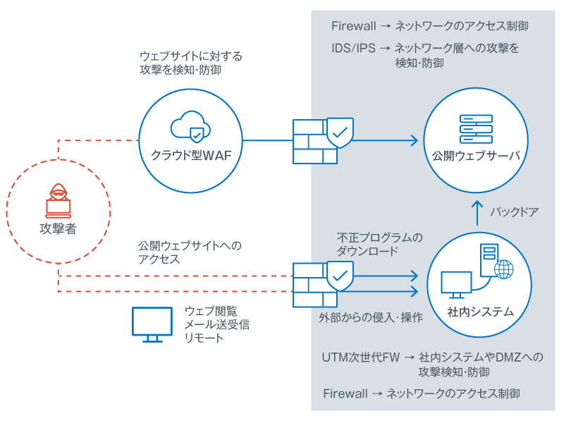 ネットワークやサーバを外部から守る攻撃手段の代表的なものとして、F/W(ファイアウォール)、IPS(IDS)、Webアプリケーションファイアウォール(WAF)があります。それぞれの得意分野がある中で守るべきものを明確にすることで効果的な対策ができます。