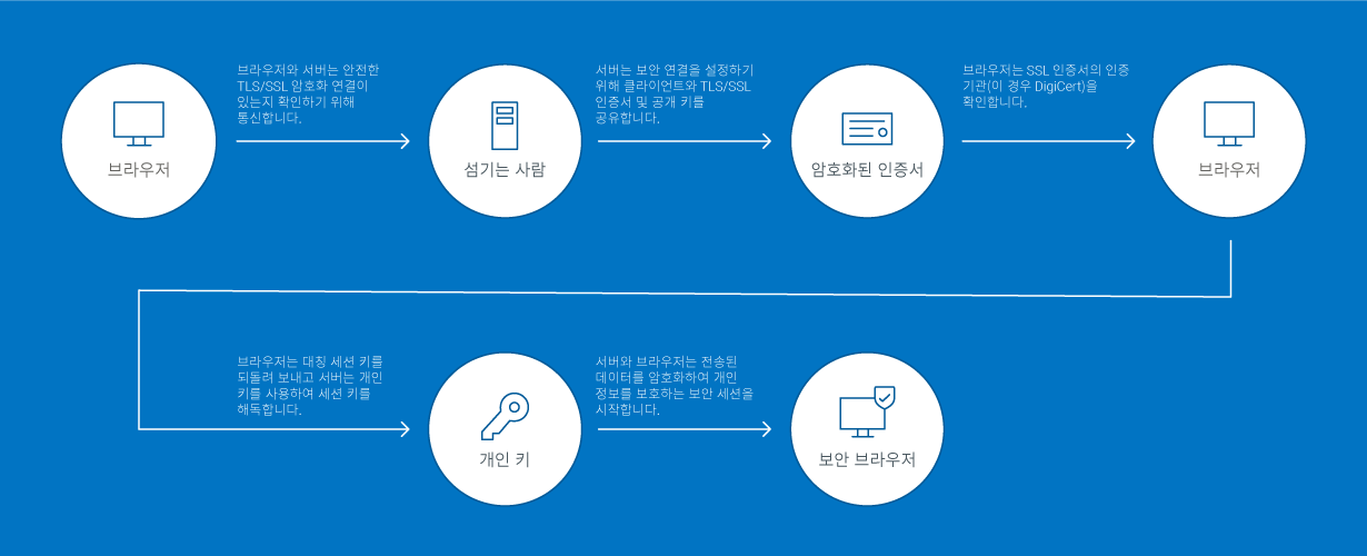 “TLS/SSL 핸드셰이크”라는 사용자에게 보이지 않는 프로세스가 웹사이트를 방문할 때마다 거의 순간적으로 웹 서버와 웹 브라우저 사이에 보호된 연결을 생성합니다. TLS/SSL 인증서로 보호된 웹사이트는 브라우저 주소 표시줄에 HTTPS와 작은 자물쇠 아이콘이 표시됩니다. TLS/SSL 인증서는 최종 사용자의 정보가 전송되는 동안 해당 정보를 보호하고, 사용자가 합법적 웹사이트 소유자와 상호작용할 수 있도록 웹사이트의 조직 신원을 인증하는 데 사용됩니다.