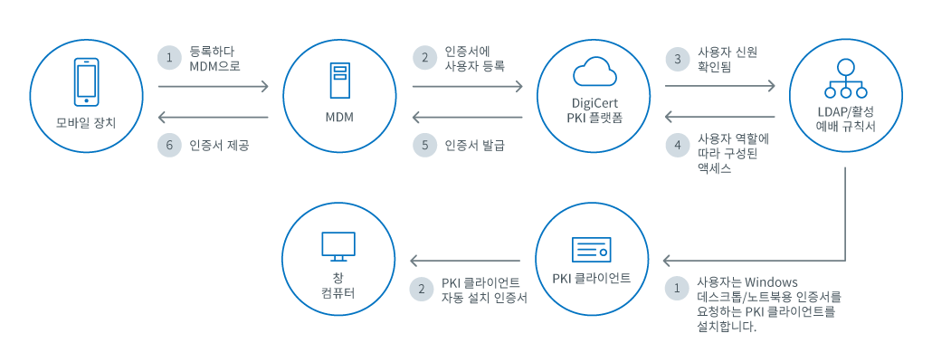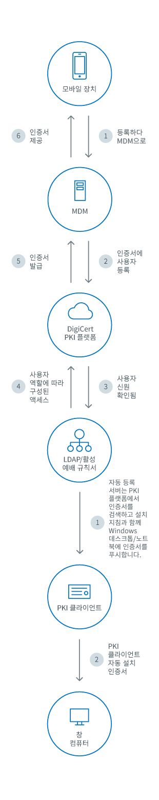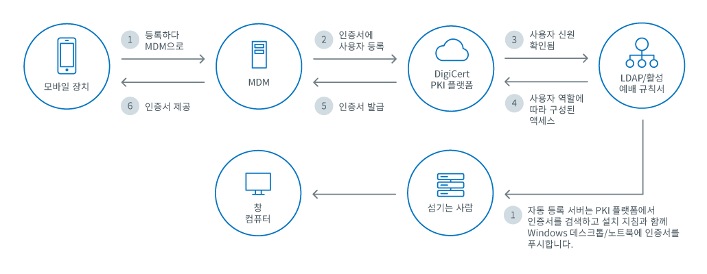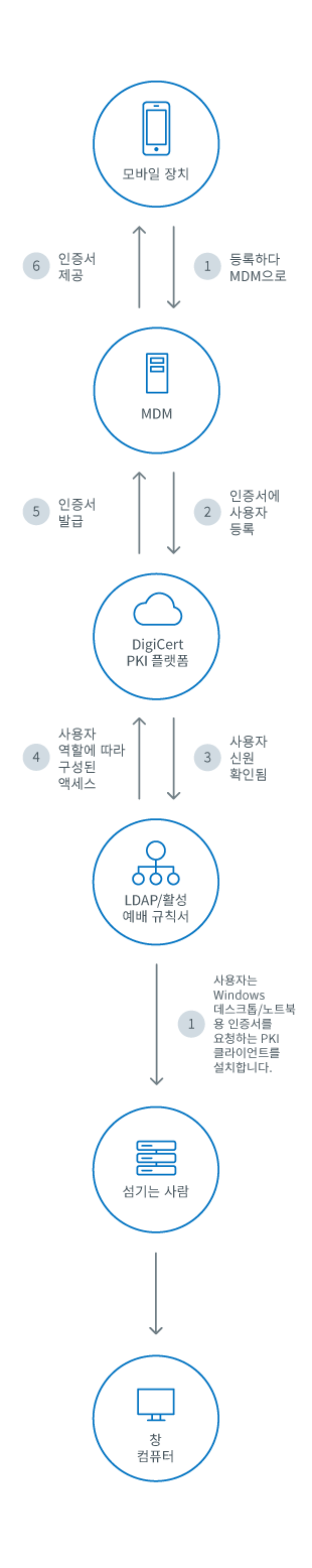 모바일 장치에서도 유연하게 사용할 수 있습니다. 모바일 환경에 보안을 구축하려면 그에 걸맞은 유연한 암호화 및 ID 관리 플랫폼이 필요합니다. DigiCert® 엔터프라이즈 PKI 관리자를 사용하면 모든 모바일 장치 인증서를 한 곳에서 제어하고 관리할 수 있습니다.
