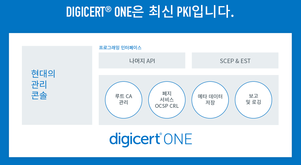 DigiCert ONE은 최신 PKI 매니저 제품으로 빠르게 필요에 맞춘 구성으로 배포될 수 있도록 제작된 강력한 플랫폼에서 제공됩니다.
