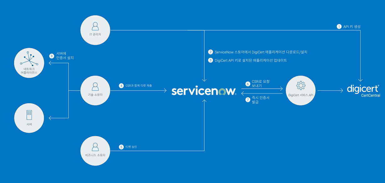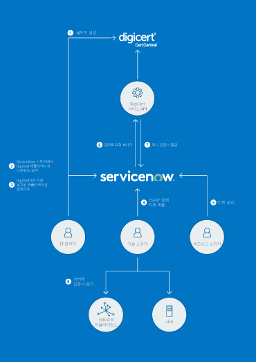 DigiCert CertCentral은 ServiceNow와 원활하게 통합되어 단일 화면에 인증서 관리를 통합합니다. 관리자는 역할과 권한을 설정하고, 갱신을 자동화하며, 사전 확인된 인증서를 가상으로 주문하고 거의 즉시 다운로드할 수 있으며 이 모두가 사용하기 쉬운 앱에서 해결됩니다. 지금 다운로드하세요.