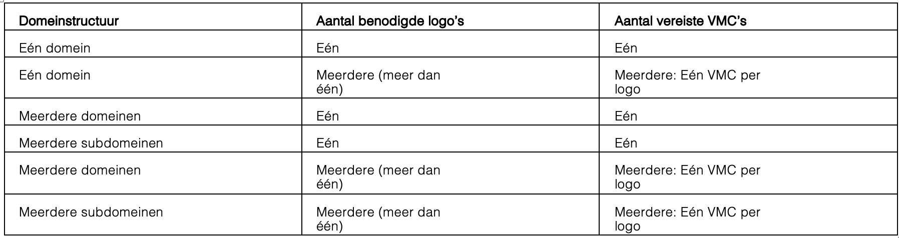 Over het algemeen is één VMC per domein voldoende voor een organisatie. Als vuistregel kunt u hanteren dat bij één logo één VMC hoort. Als u twee of meer logo’s gebruikt, hebt u voor elk logo een VMC nodig. Binnenkort komen voor de beveiliging van meerdere domeinen Multi-SAN VMC’s verkrijgbaar.