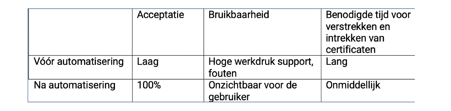 Wat wordt er gemeten: Acceptatie is een belangrijk meetgegeven. Installeren gebruikers certificaten waar dat nodig is? Bellen ze met de supportafdeling voor hulp bij de configuratie? Zorgen problemen met certificaten ervoor dat werknemers niet productief kunnen zijn na onboarding, of dat er te lang zit tussen het vertrek van een werknemer en het intrekken van diens systeemtoegang?