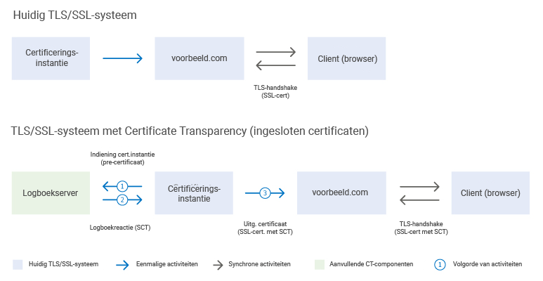 Certificate Transparency (CT) wordt in de bestaande infrastructuren van certificeringsinstanties gebruikt om na uitgifte van een certificaat te valideren dat de betreffende entiteit geautoriseerd is om SSL-certificaten uit te geven.
