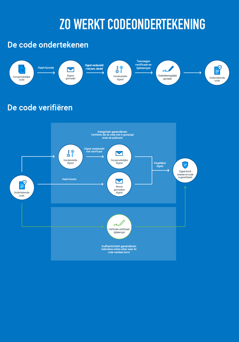 Codeondertekening is een vereiste van alle grote softwareplatformen, zoals Java en Microsoft, om de verspreiding van malware te voorkomen. Het is ook een best practice op het gebied van beveiliging om code te ondertekenen, om te voorkomen dat klanten en gebruikers code downloaden die is gemanipuleerd of afkomstig is uit onbekende bronnen. Hiermee maakt u een duidelijk onderscheid tussen de code of software van uw organisatie, en code die zodanig is verpakt dat die afkomstig lijkt te zijn van uw organisatie. En wanneer de software openbaar beschikbaar wordt gemaakt, krijgen gebruikers mogelijk een veiligheidswaarschuwing te zien als de software niet is ondertekend. Bij het bouwen en ontwikkelen van code voor intern gebruik zorgt codeondertekening voor verantwoording en controle.