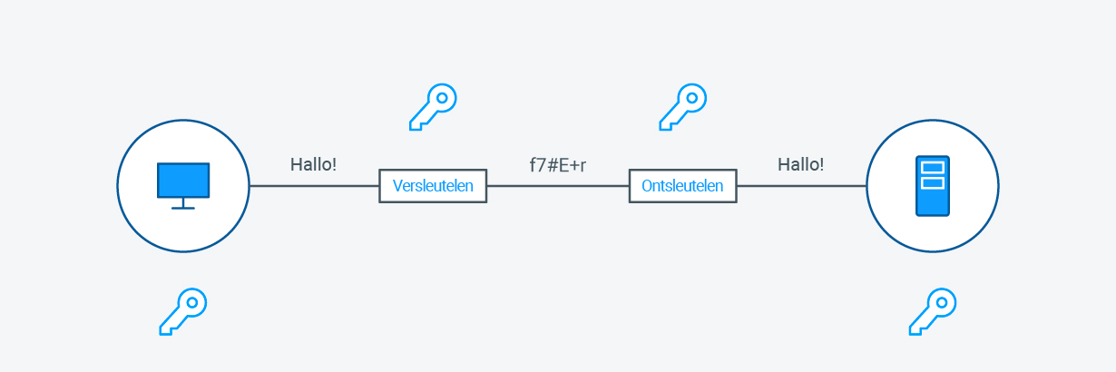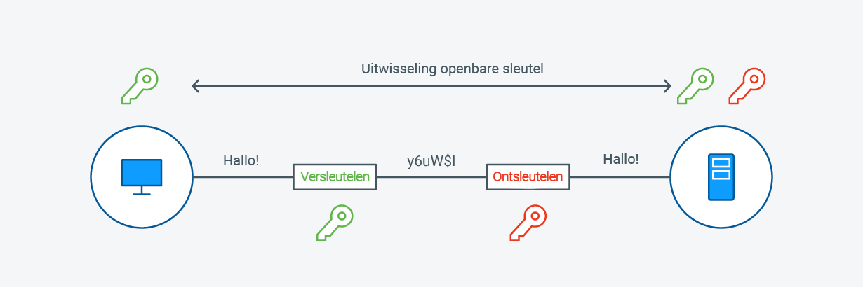 Bij asymmetrische encryptie doet dit probleem zich niet voor. Zolang u uw persoonlijke sleutel geheimhoudt, kan niemand uw bericht ontcijferen. U kunt de bijbehorende openbare sleutel verspreiden zonder dat u zich zorgen hoeft te maken over wie die in handen krijgt. Iedereen met de openbare sleutel kan gegevens versleutelen, maar alleen degene met de persoonlijke sleutel kan die ontsleutelen.