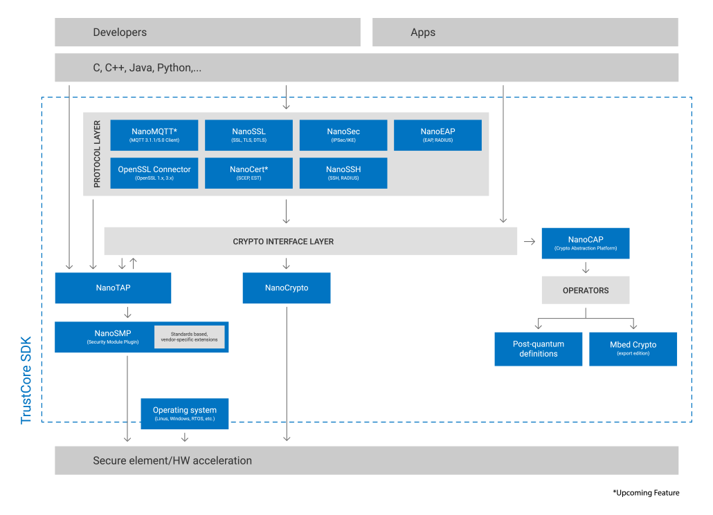 TrustCore SDK integreert met uw bestaande codebase en biedt compatibiliteit met een breed scala aan API's en programmeertalen zoals C, C++, C#, Java en Python. Daardoor hoeft u niet te vertalen of herschrijven binnen uw ontwikkelingsworkflow.