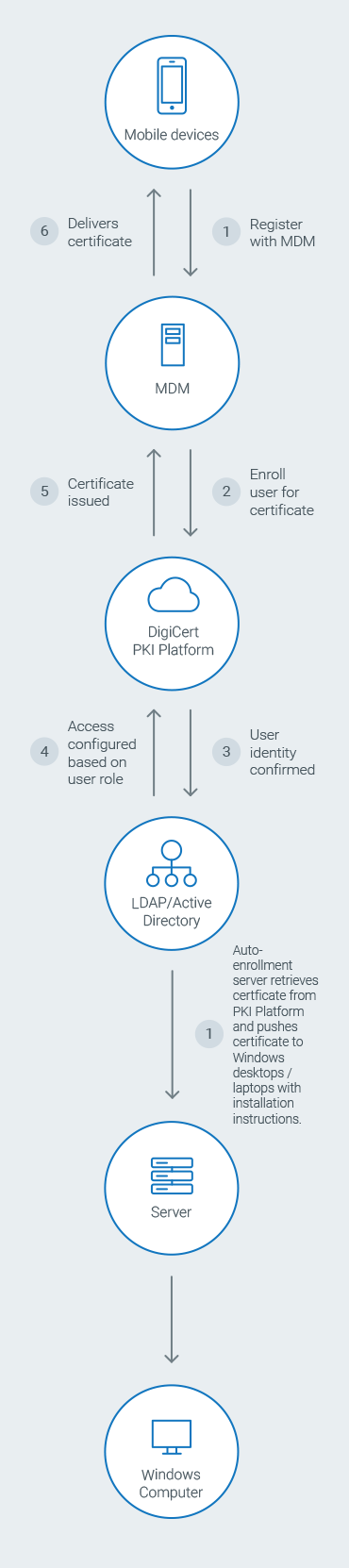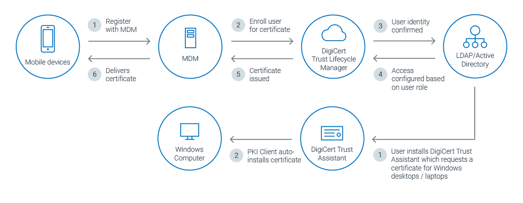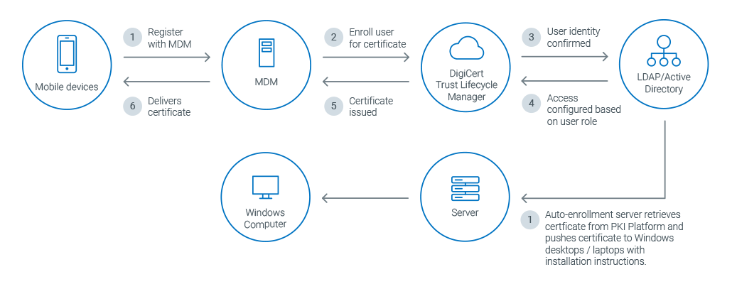 DigiCert® Trust Lifecycle Manager protects your data, email and applications, and gives you full control over your entire UEM/MDM landscape from a single management point. Whatever you deploy—and no matter what your employees bring with them—PKI provides trusted encryption and identity.