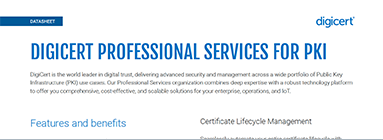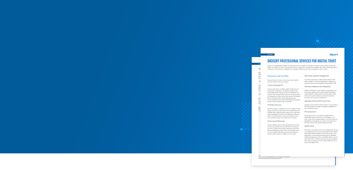 The DigiCert Professional Services team combines deep expertise with a robust technology platform to offer you comprehensive, cost-effective, and scalable solutions for your enterprise, operations, and IoT needs.