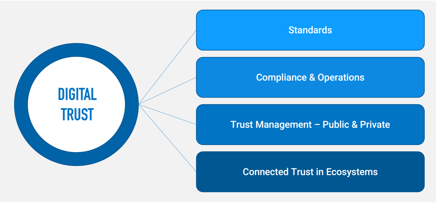 A confiança digital se origina de quatro componentes essenciais: padrões, conformidade e operações, gerenciamento de confiança e confiança conectada.