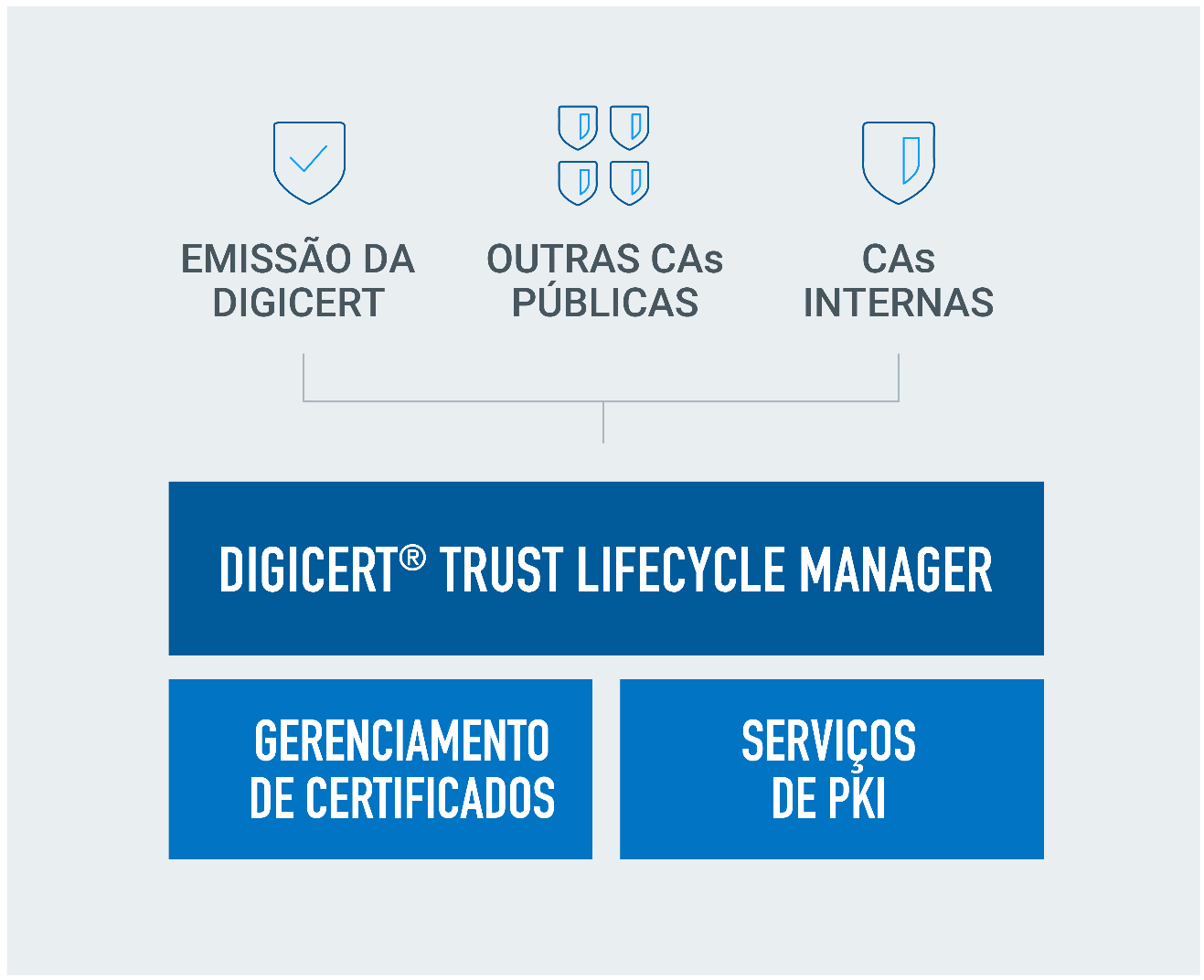 Para atender a esse imperativo estratégico do gerenciamento da confiança digital, a DigiCert tem a satisfação de anunciar o DigiCert® Trust Lifecycle Manager. O Trust Lifecycle Manager é diferente de outras soluções de gerenciamento de certificados porque não só atende à necessidade de centralizar a visibilidade e o gerenciamento de certificados públicos e privados em toda a organização e em todas as CAs (normalmente chamado de gerenciamento de ciclo de vida de certificados, ou CLM), mas também unifica o CLM com os serviços de PKI que regem a emissão da PKI privada, desde a criação e o gerenciamento de CAs e ICAs até a emissão dos certificados que regem a segurança de usuários, dispositivos e servidor, com integrações que levam esses certificados até a instalação de aplicativos de terceiros e da entidade final. Essa abordagem unificada é uma maneira completa de administrar toda a pilha da confiança digital, com o respaldo do suporte e de serviços que contribuem para a resiliência da confiança digital.