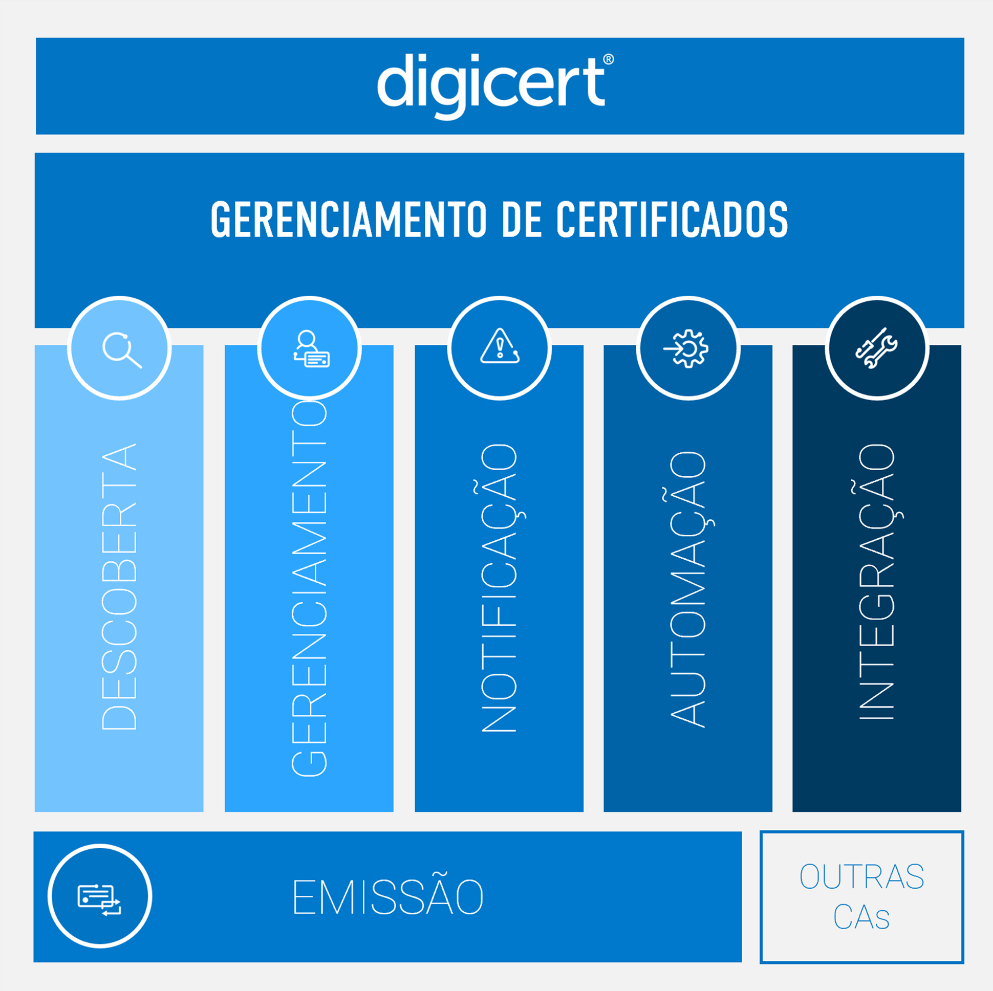 Para o gerenciamento do ciclo de vida dos certificados, o Trust Lifecyle Manager trata de todos os aspectos, desde a emissão até a renovação, com a confiança pública de alta qualidade da DigiCert. Com o Trust Lifecycle Manager, as empresas têm todas as ferramentas necessárias para o gerenciamento da confiança digital, incluindo descoberta, automação e integração. O Trust Lifecycle Manager também reduz a carga de descoberta e automação da TI, com notificações que direcionam a atenção somente aos itens que exigem ação.
