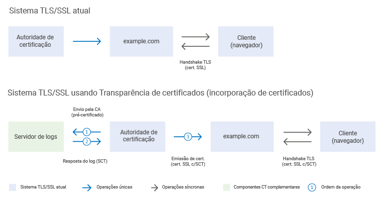 O processo de emissão de certificados é mostrado abaixo, com as novas etapas introduzidas pela CT destacadas em azul.