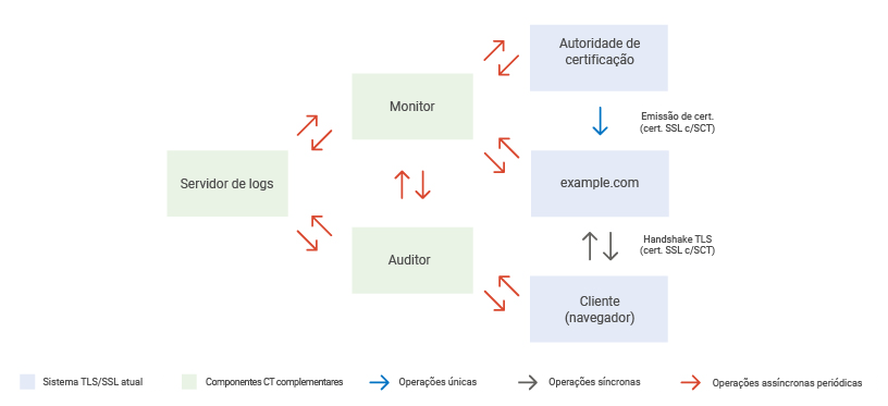A CT funciona dentro do sistema de CA com confiança pública. Com a CT, as CAs podem incluir evidências da emissão de certificados em um log público, e os navegadores podem verificar esses SCTs durante o handshake. O log de certificados comprova a operação correta da CA e apresenta insights sobre as operações da CA.