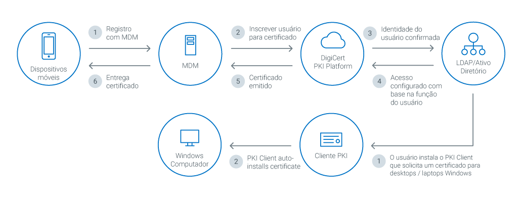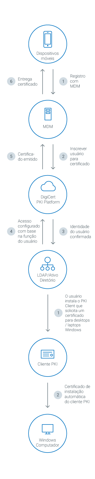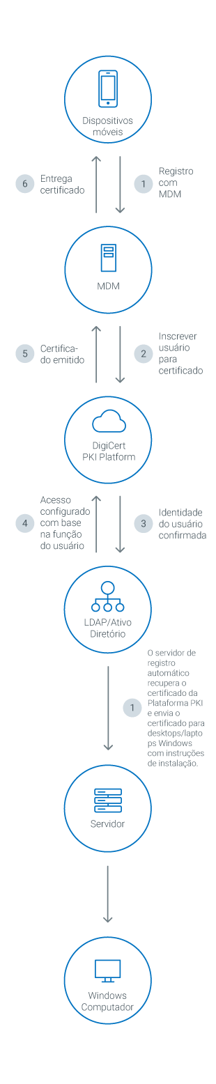 A flexibilidade de uso é uma vantagem dos dispositivos móveis. O aumento da segurança no ambiente móvel requer uma criptografia igualmente flexível e uma plataforma de gerenciamento de identidade. Com o DigiCert Trust Lifecycle Manager, você pode controlar e administrar todos os seus certificados de dispositivos móveis em um só lugar.