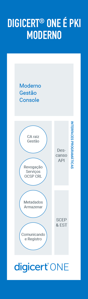 O DigiCert ONE é um pacote de gerenciadores de PKI modernos fornecidos em uma plataforma poderosa, desenvolvida para implantação rápida e na configuração da sua preferência.