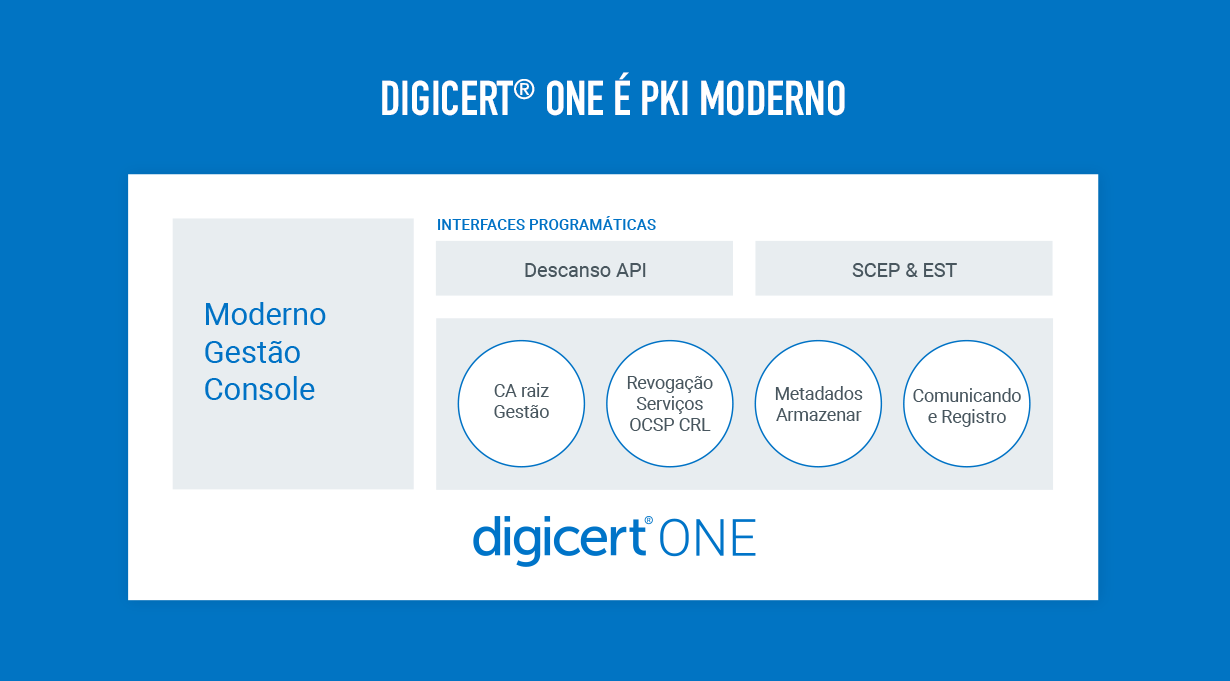 Há décadas, a infraestrutura de chaves públicas e privadas protege dados em trânsito, autentica dispositivos e usuários e assegura a integridade do código em tudo, desde e-mails e documentos até aplicativos. Agora modernizada como parte do DigiCert ONE, a PKI é altamente disponível e bastante escalável e flexível, tanto para a nuvem quanto para as demandas do 5G.