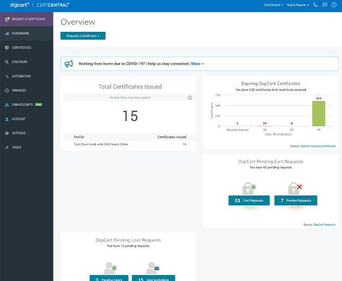 Simplifique o gerenciamento de certificados DigiCert com a CertCentral. Automatize a emissão, a renovação e a revogação de certificados DigiCert, GeoTrust e Thawte TLS/SSL por meio do ACME. Para gerenciamento de certificados independente de fornecedor e automação avançada, explore o DigiCert Trust Lifecycle Manager.