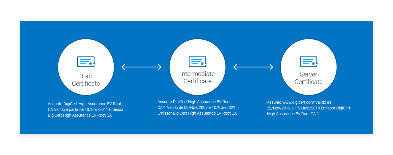 Na imagem abaixo, você pode ver a cadeia de certificados. Ela conecta o certificado do servidor ao certificado raiz da CA (neste caso, a DigiCert) por meio de um certificado intermediário.