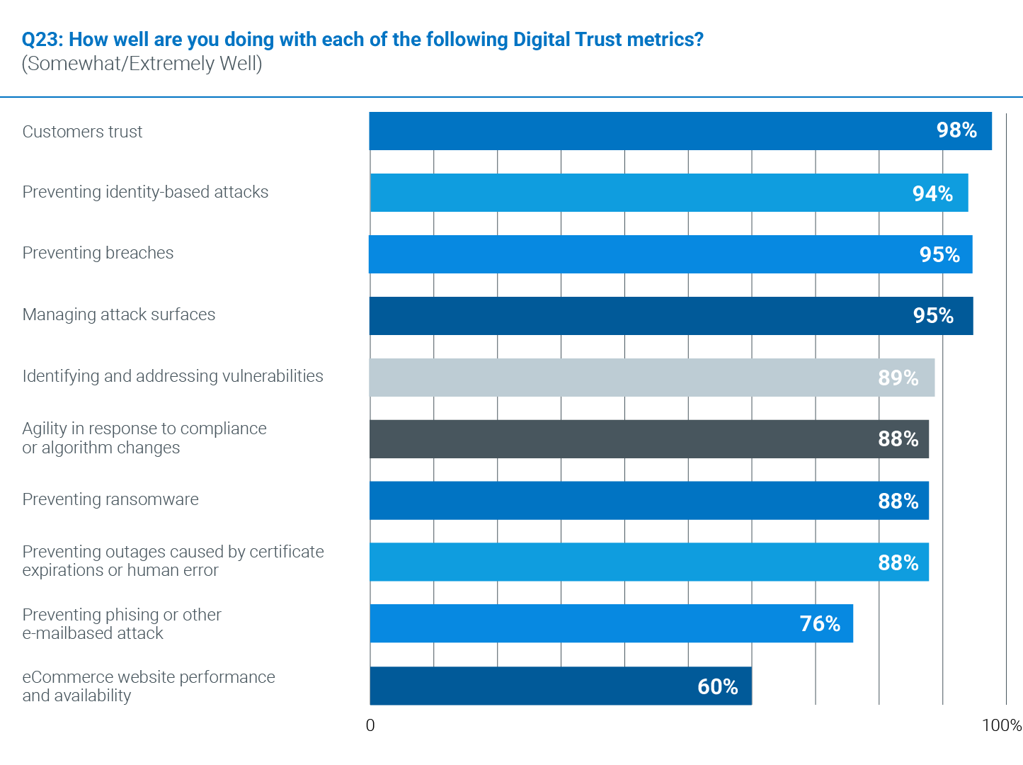 Enterprises are doing quite well across a broad set of digital trust goal metrics. Take their top goal (customer trust) for example. 98% are doing well with this goal (with 61% doing extremely well). They are also doing well with preventing breaches (95%, with 51% doing extremely well) and identity-based attacks (94%, with 50% doing extremely well).
