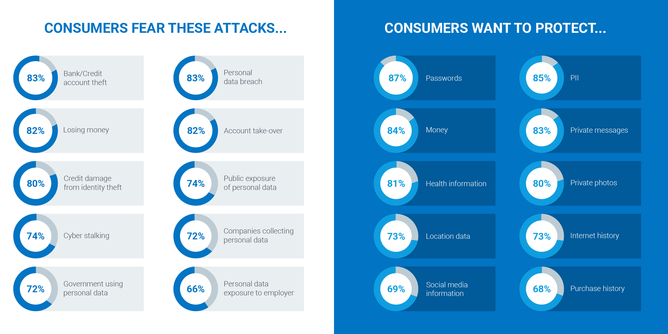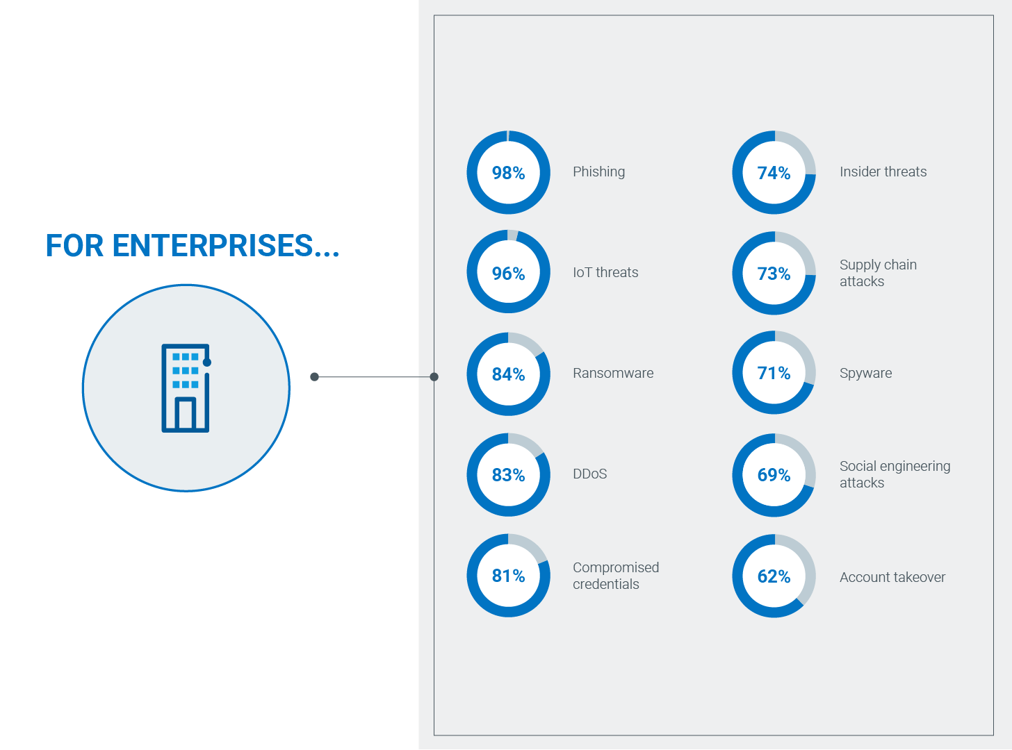 We wondered whether enterprises were on the same page as consumers in terms of helping protect what matters most to consumers (passwords, personal identifiable information (PII), etc.). Virtually all attacks that compromise consumer data start with email attacks4. Yet, with all that enterprises do to protect consumers, they rated protecting against phishing attacks as second from the bottom in terms of how they are doing. Furthermore, they rated phishing as the attack they are most concerned about.