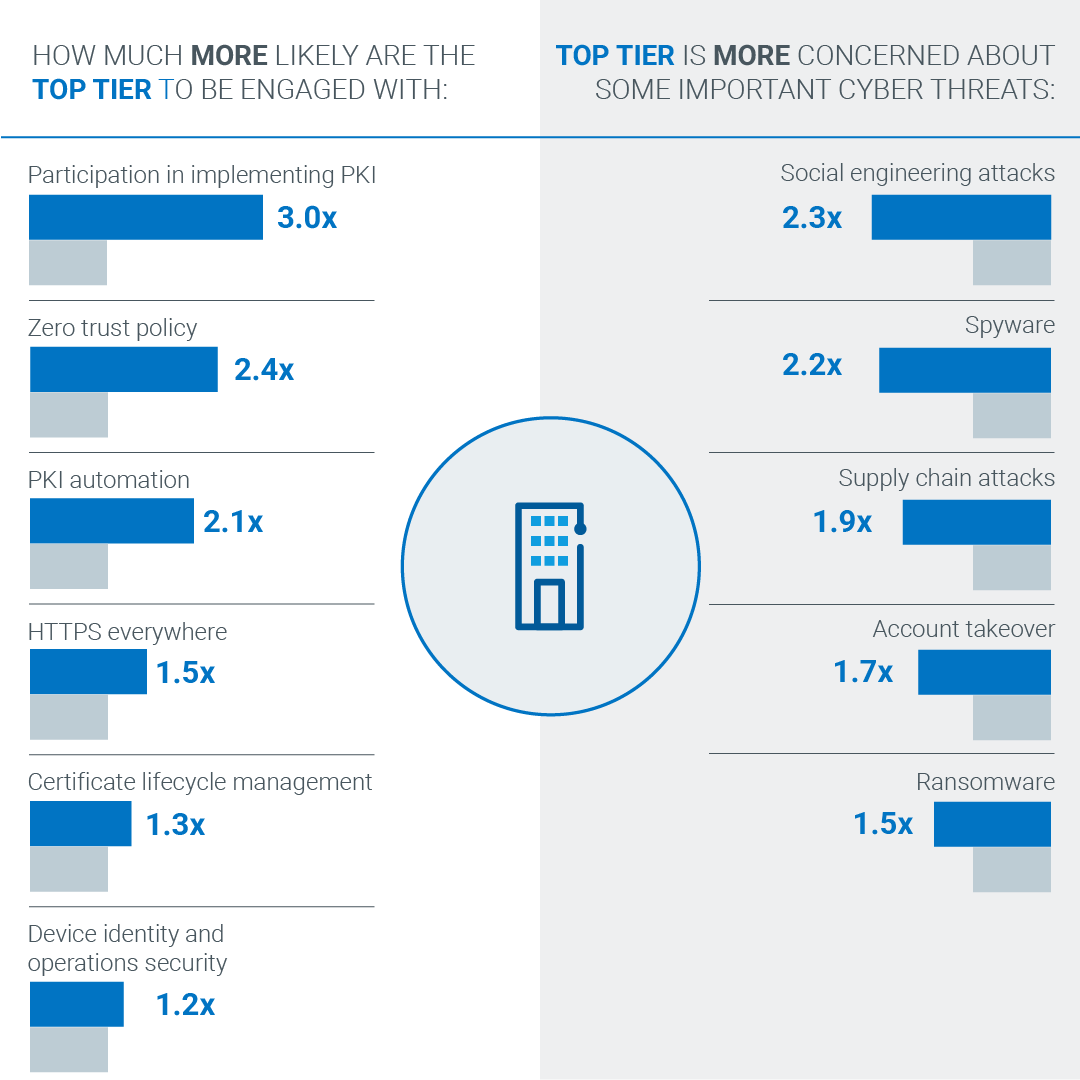 More Engaged with Common Cyber Safeguards: The top tier is up to three times as likely to be engaged with important cyber-security safeguards.