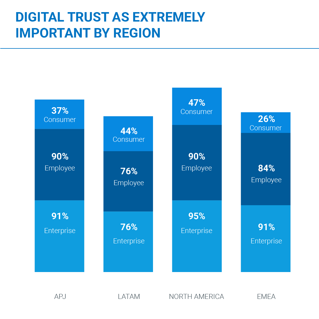 For enterprises and employees, Latin America lags in terms of feeling digital trust is extremely important. For consumers, APJ and EMEA lag. That 26% of EMEA consumers say digital trust is extremely important was surprising, given the strict EU GDPR laws enacted in 2018.