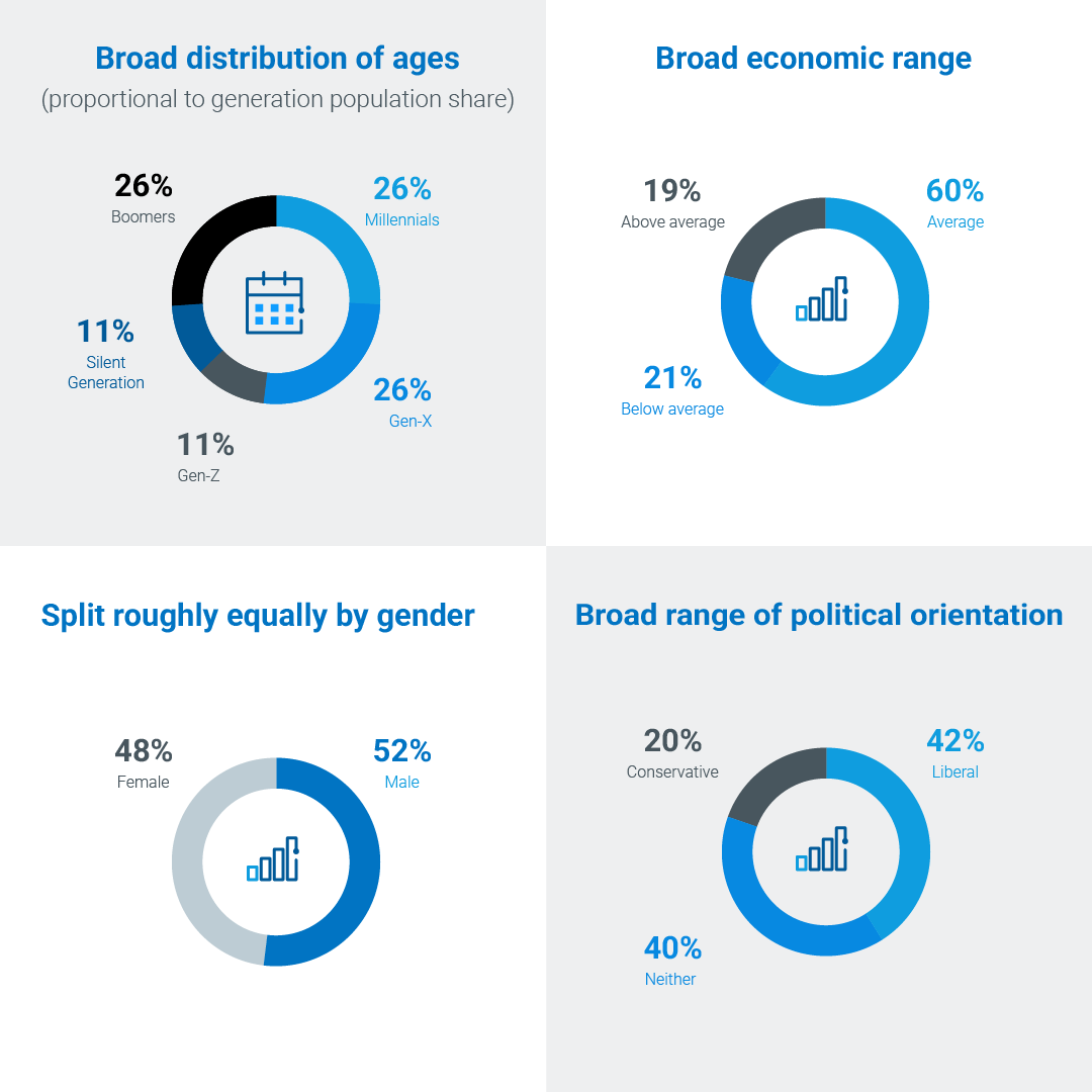 We surveyed 400 global consumers (same regions) across a wide range of ages, genders, political orientations and economic statuses: Figure B.