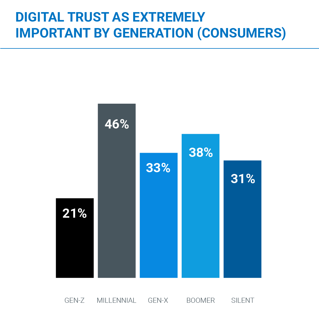 Interestingly, the two youngest generations (and the only digital natives) are the least and the most likely to say digital trust is extremely important.
