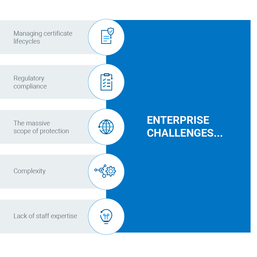 Digital Trust Challenges: Enterprises are well along in their digital trust journey, but it hasn’t been easy. The number one challenge IT cited was managing digital certificates, rated as important by 100% of enterprises. Regulatory compliance and handling the massive scope of what they are protecting was a close second, at 99%. Rounding out the challenges are complexity — securing a complex dynamic, multi-vendor network — and a lack of staff expertise.