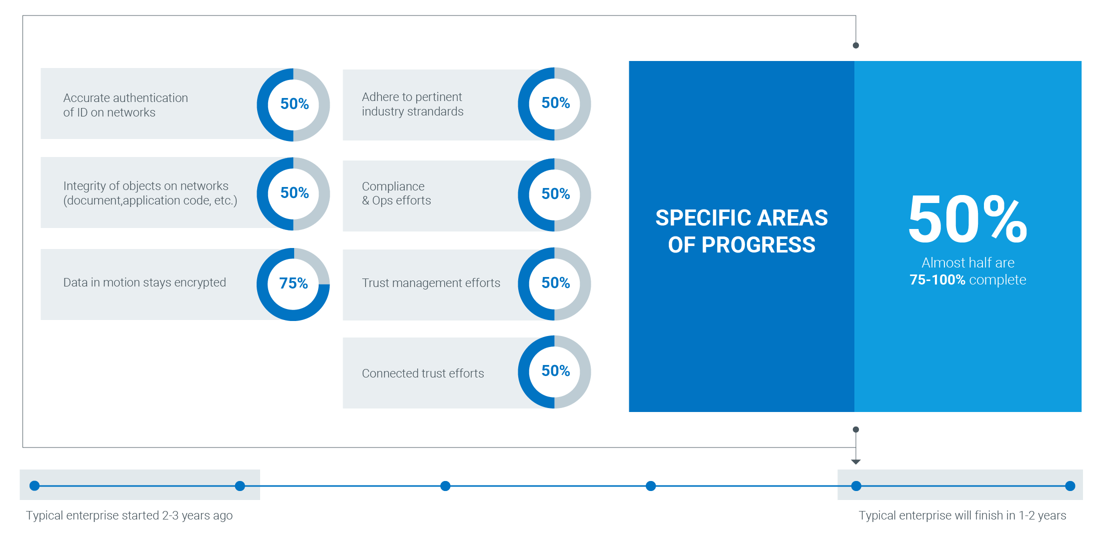 Enterprises are engaged with digital trust. The typical organization began working on digital trust two to three years ago and has completed 75% (or more) of the journey so far. The typical organization will complete its digital trust journey in the next one to two years.