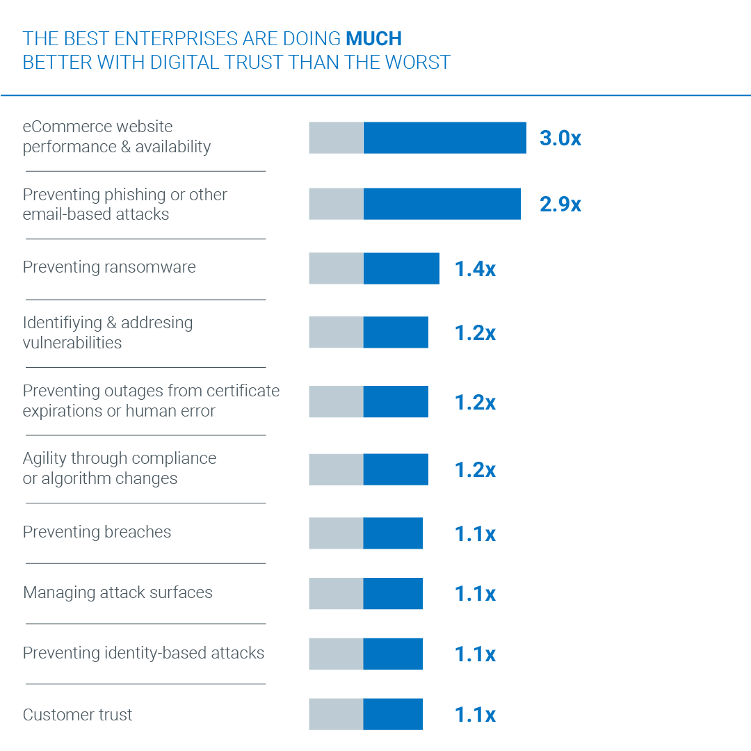 It is axiomatic that the top tier is doing better with the digital trust metrics, since that is how we divided the respondents into tiers in the first place. But what’s interesting is just how much better the top tier is doing than the bottom tier. For example, three times as many top-tier enterprises report doing well with eCommerce website performance and availability, and 2.9 times as many say they’re doing well at preventing phishing or other email-based attacks. The top tier ranges from 10% better to 300% better in every metric: