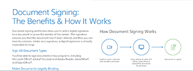 More secure (and far less time-consuming) than a notary stamp, a document signing certificate allows individuals and organizations to establish trust in the origin, authenticity and integrity of documents and e-signatures.