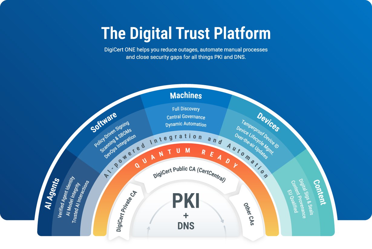 DigiCert® Document Trust Manager is part of DigiCert® ONE, the powerful platform that allows you to establish, manage and extend trust throughout your entire organization. Seamless integration tools help you maximize your existing investments in legacy Cas, software, hardware, devices and teams. At the same time, the architecture of DigiCert ONE gives you the flexibility to scale and adapt to changing workflows and systems as your organization evolves. Build, manage and grow trust for networks, users, email, code, web, IoT and more.