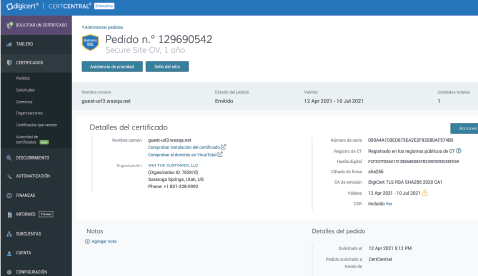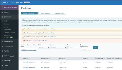 En la cuenta de CertCentral, desplace el cursor sobre «Certificados» en el menú de la izquierda y haga clic en «Pedidos».