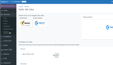 A continuación, seleccione la imagen del sello que desee exhibir en el sitio web y configure su tamaño (pequeño, mediano o grande). A la derecha de la página, se muestra una vista previa de la opción seleccionada.