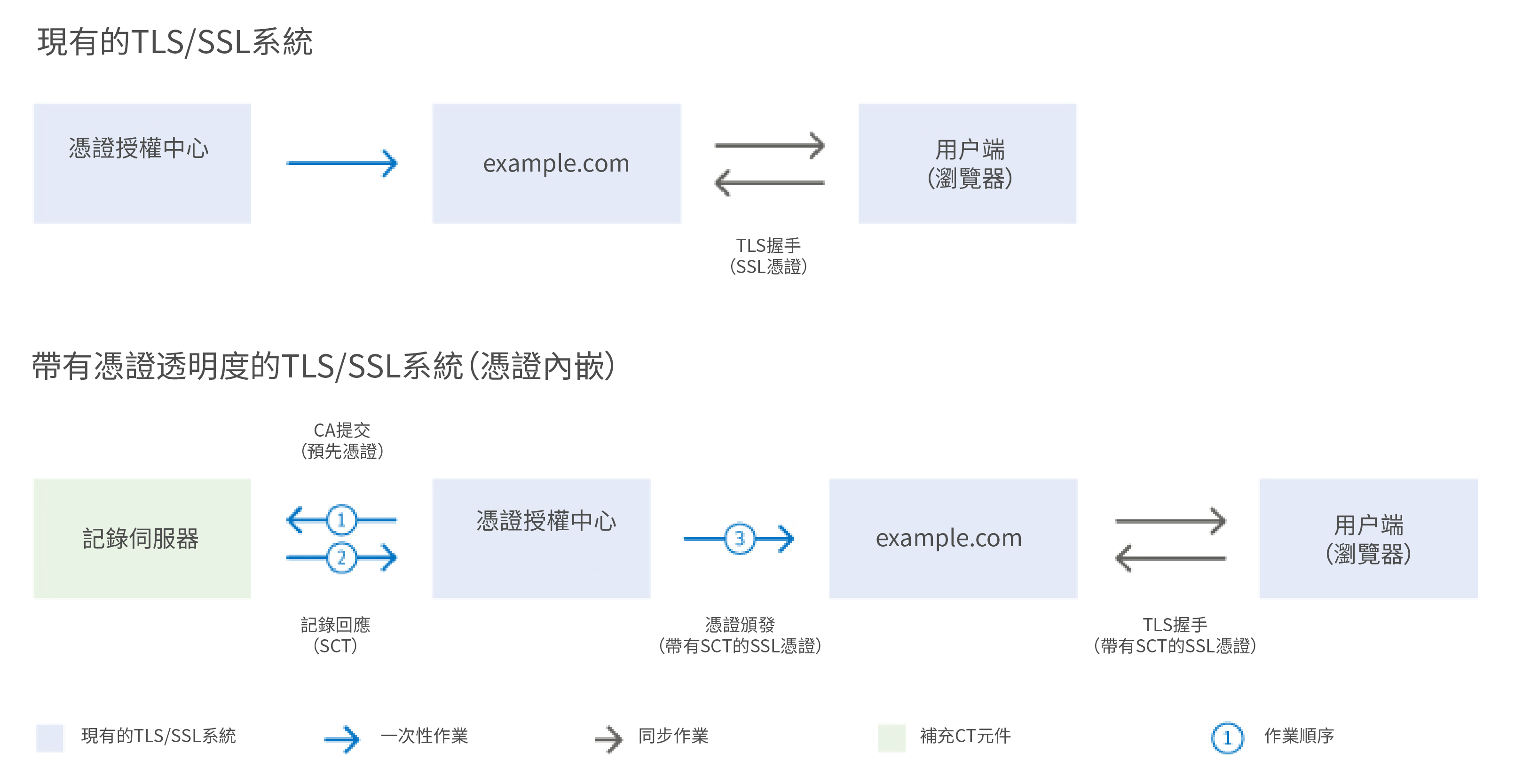 - 瀏覽器透過OCSP裝訂、TLS擴充或憑證中內嵌的訊息驗證在TLS握手期間提供的SCT