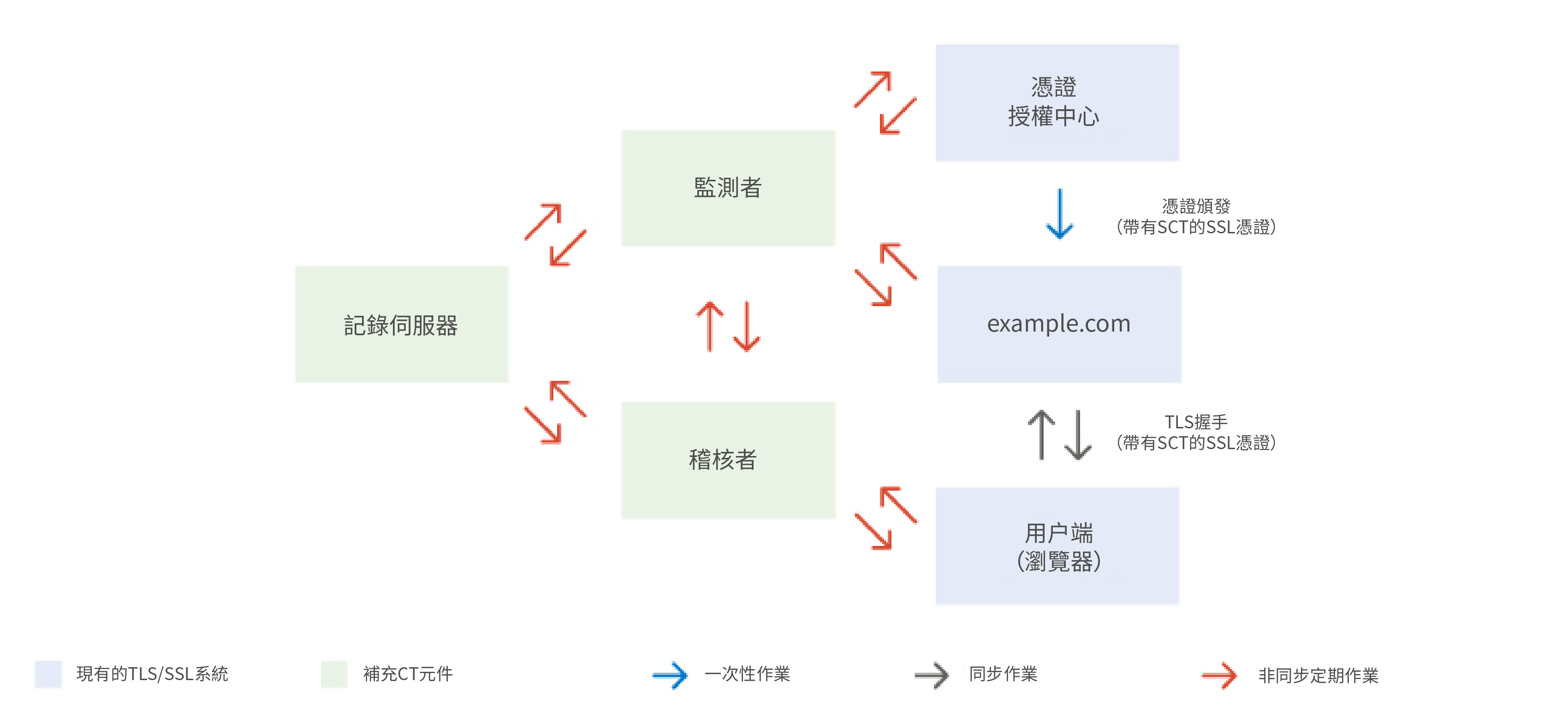CT在現有的公開信任CA系統中發揮作用。透過使用CT,CA可以在公用記錄中納入憑證頒發的證據,而瀏覽器可以在握手期間檢查這些SCT。對憑證進行記錄是證明CA正確作業的證據,並能讓人們深入瞭解CA作業。