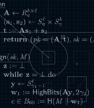 在其底部,Dilithium在Lyubashevsky的Fiat-Shamir with Aborts上執行,以實現其辨識格方案。這個範例重複執行,直到驗證一個沒有中止的迴圈反覆運算。使用該通訊協定的結果是小得多公開金鑰,從而以更低的能耗實現更高的安全性和效率。