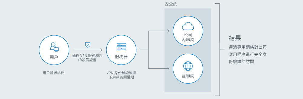 透過為端點啟用具有 身分驗證功能的VPN來降低風險。 如果您使用平台對您網路的所有位置點進行保護並且該平台還能讓您高效地管理使用者對各種連線事物的存取,那麼您就可以高枕無憂。