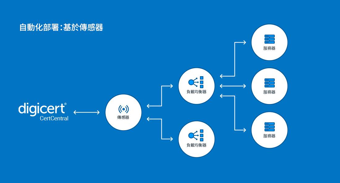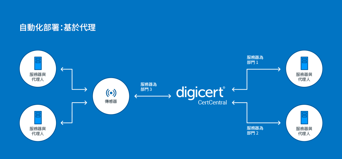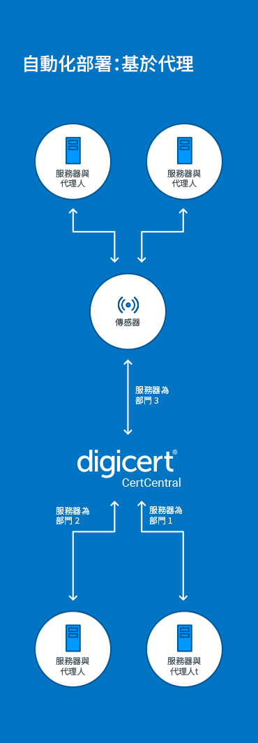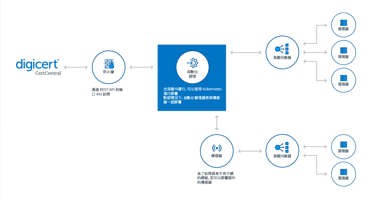 DigiCert Automation Manager自動安裝並續訂專用與公共OV及EV證書,同時降低向互聯網開放防火牆的風險: