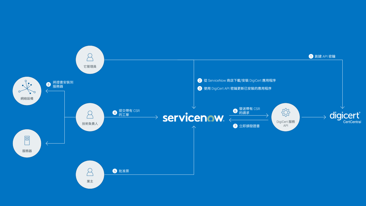 DigiCert CertCentral與ServiceNow無縫整合以便透過一個螢幕統一憑證管理,能讓管理員設定角色和權限、實現續訂的自動化、近乎即時地訂購和下載預先驗證的憑證等——所有這些都能透過易於使用的應用程式來完成。立即下載。