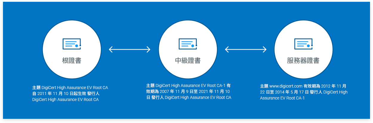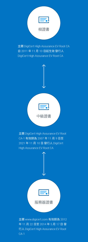 在下圖中,您可以看到所謂的憑證鏈結。它透過中繼憑證將您的伺服器憑證連線到CA的根憑證(在本例中為DigiCert)。
